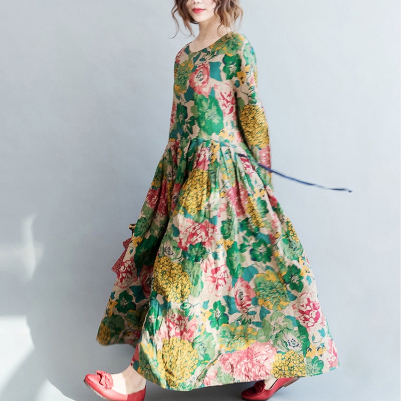 2026 Ethnic Print Long Sleeve Midi Dress, Plus Size