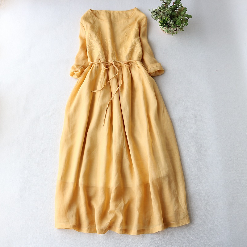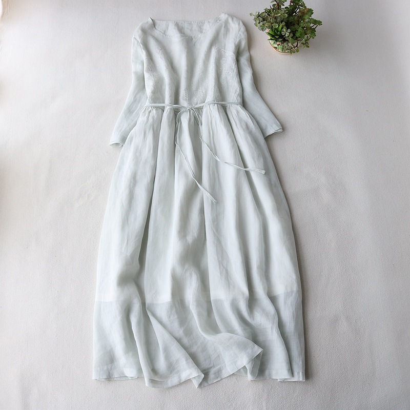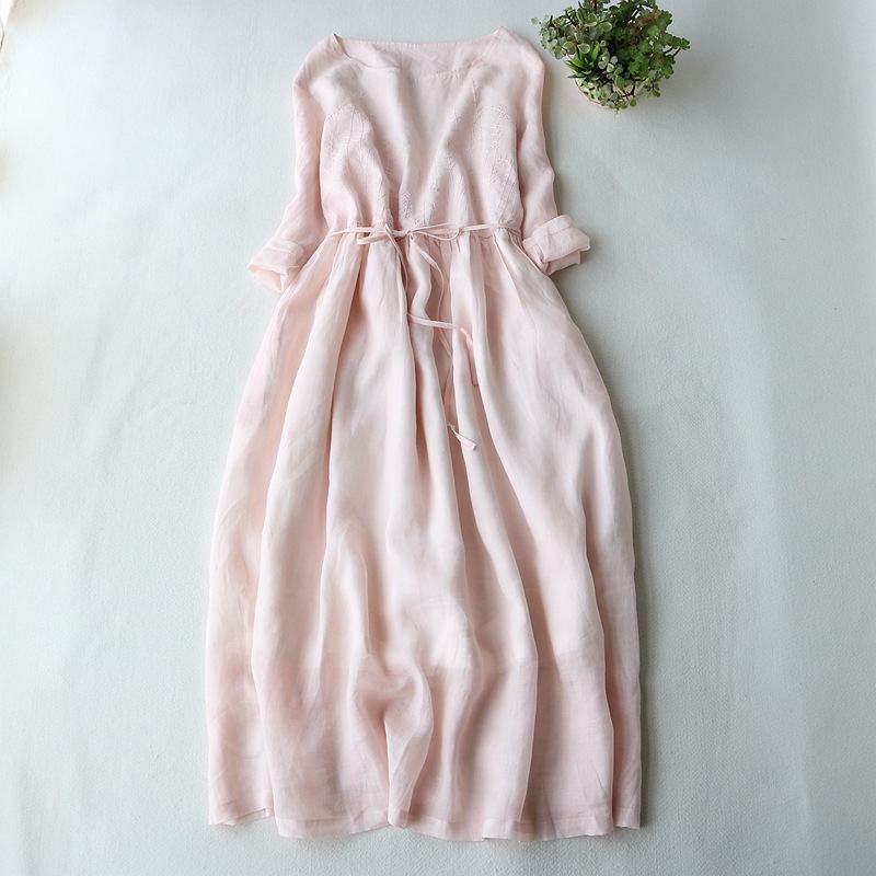 Round Neck Ramie Embroidered Solid Color Dress